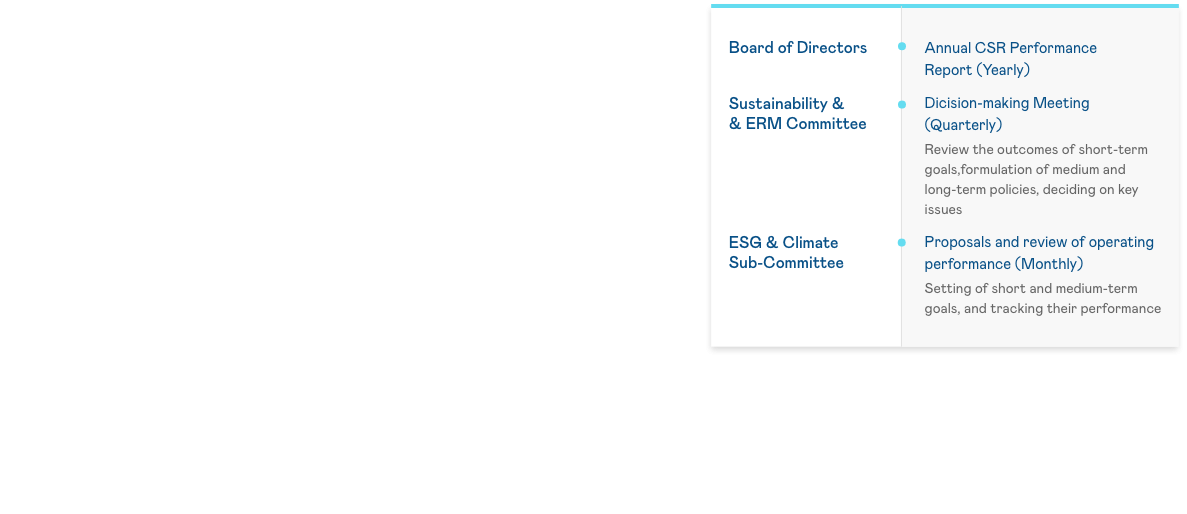 The "Sustainability & ERM Committee" consists of the Chairman and 2 independent directors. They meet twice a year and supervise sub-committees focused on sustainability and risk. Senior managers lead the sub-committees, translating the vision into goals and strategies, conducting monthly reviews, reporting major issues quarterly to the Chairman for decisions, and reporting annually on operations to the board following CSR guidelines.