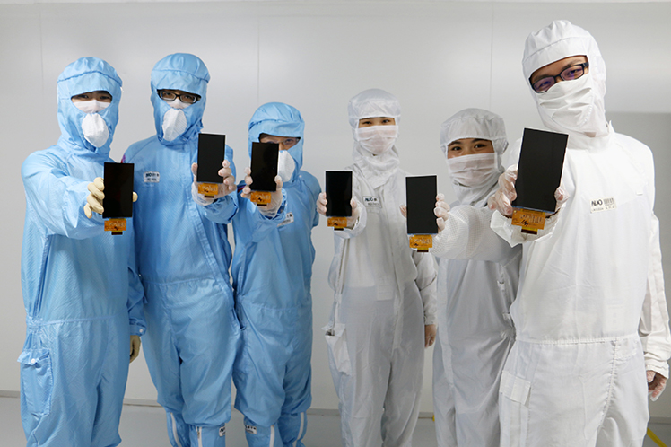 Engineers of MILANTIYU Kunshan fab demonstrate the fab’s first 5.5-inch full HD LTPS LCD |